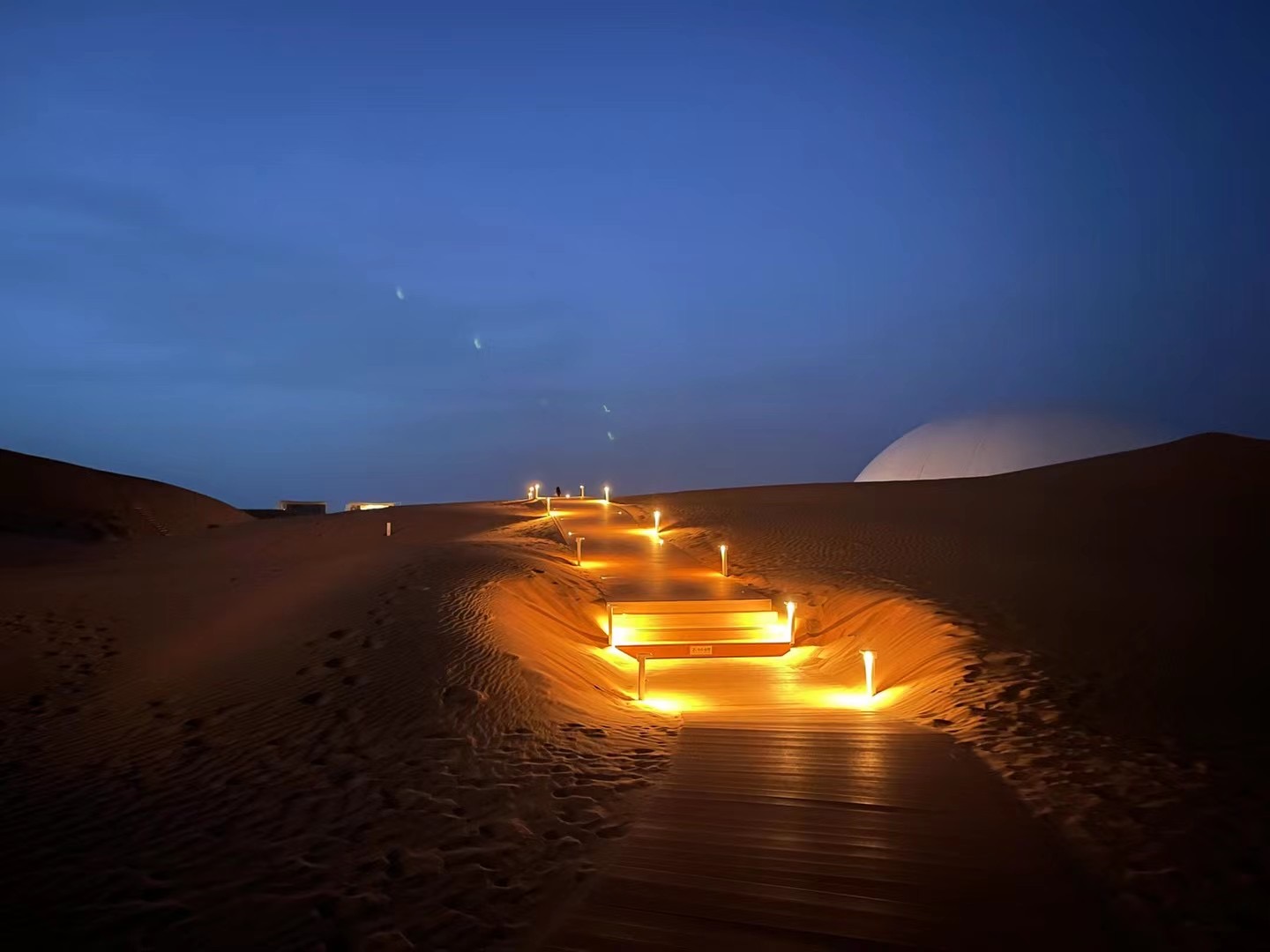 飯后,赤腳在沙上散步,待到天黑,在觀星臺席地而坐,遠望星空,亦是很愜意。散步不要走的太遠哦,沙坡頭是流動沙丘,非專業人士容易迷路。較遺憾的是我們去的幾天陰轉小雨,沒能看到滿天繁星,但月亮一樣值得一看。