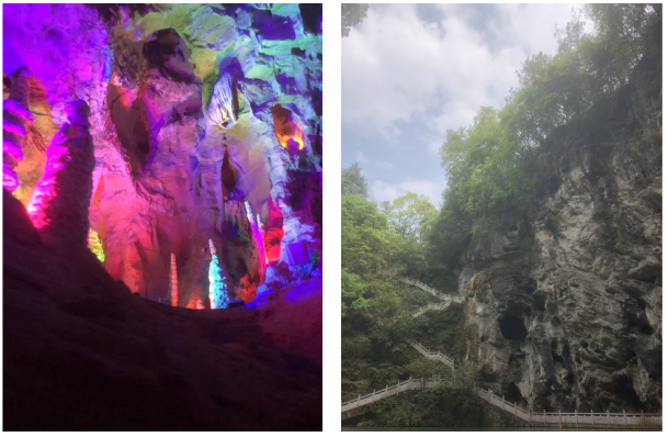 整個游玩過程中最讓人嘖嘖稱奇的是水洞坐船環(huán)節(jié),蜿蜒曲折的狹窄河道,兩側(cè)的巖壁上滿是怪石嶙峋、形態(tài)各異的鐘乳石,在五彩斑斕的燈光映射下奇幻迷離氣象萬千。正當大家都沉浸到這種奇特的美景中時,忽而迎面一陣微風,豁然開朗,眨眼已到河道盡頭,只見崖壁上滿目郁郁蔥蔥~
