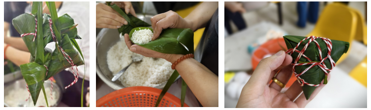在經過一番嘗試和摸索后,大家逐漸掌握了包粽子的訣竅,動作愈發流暢自如。挑選出一片寬厚的粽葉,輕輕折疊成漏斗狀,然后投放適量糯米,再加入鮮美的餡料。隨后將粽葉包裹住糯米和餡料,用細線緊緊捆綁,不一會兒一個個尖尖的三角粽便成形了。